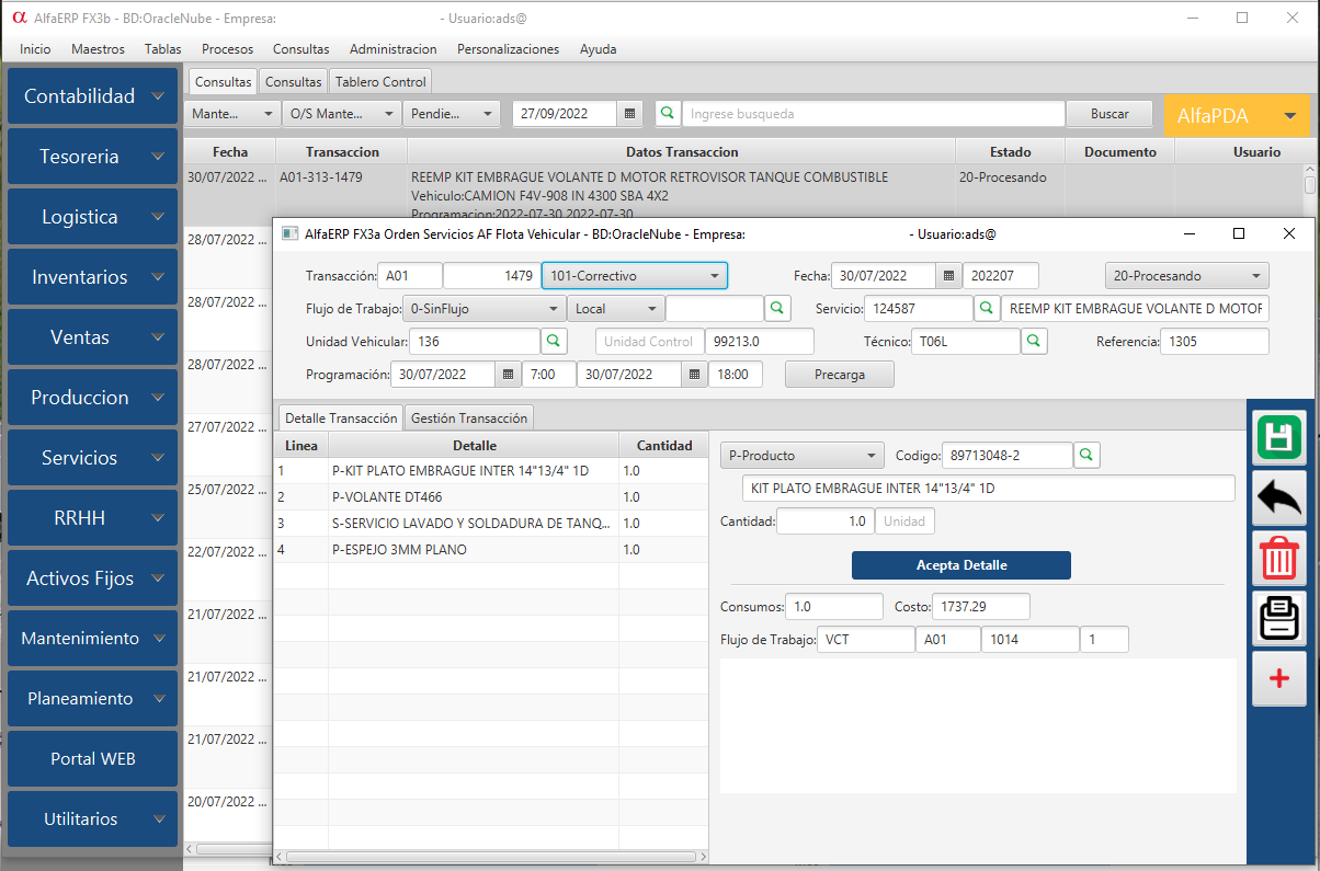 - AlfaMantenimiento es un modulo de AlfaERP, integrando automaticamente y en tiempo real sus procesos con los demas modulos del Sistema: Inventarios, Logistica, Operaciones, Contabilidad, RRHH.